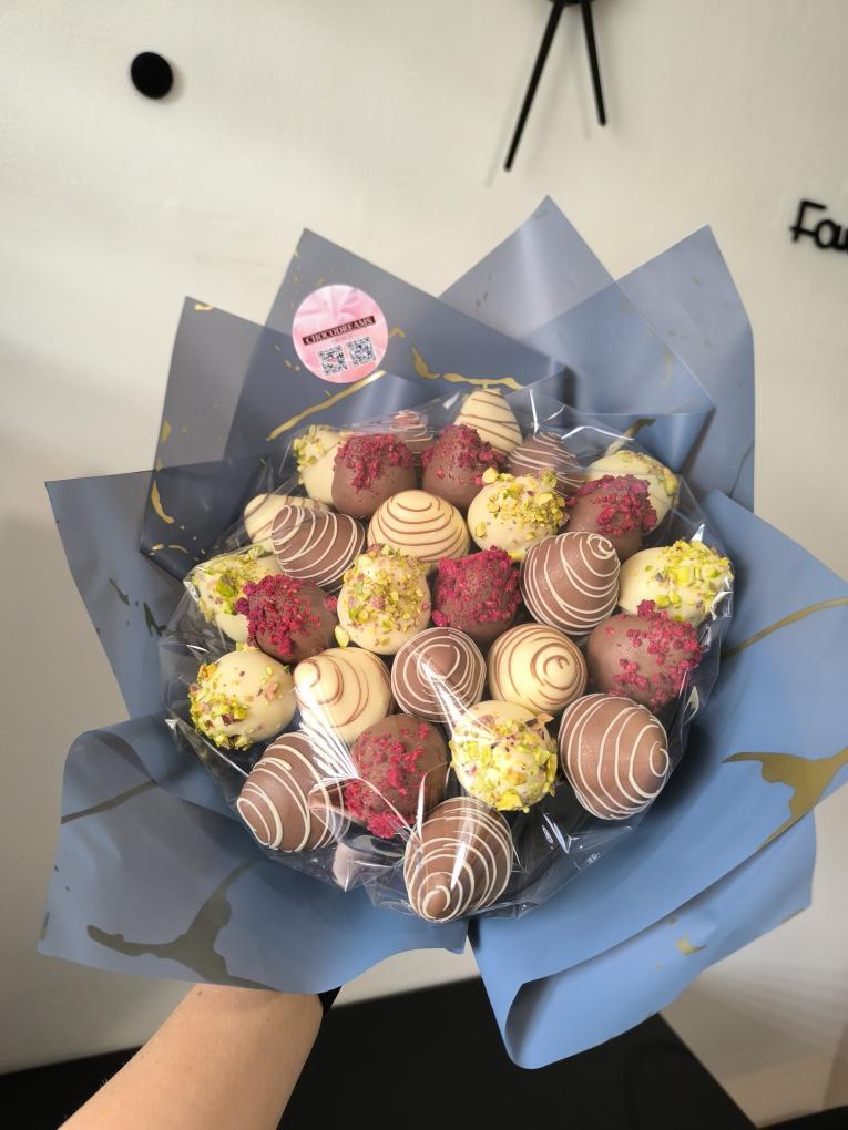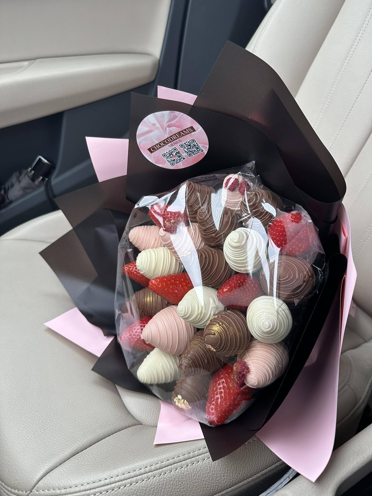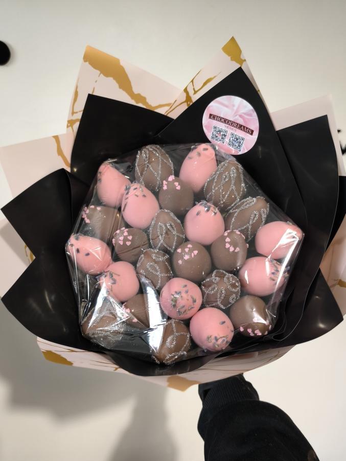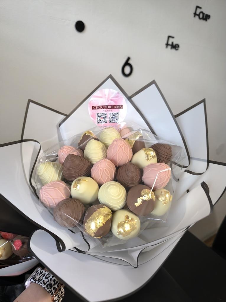 ŠVIEŽIOS, sultingos braškės, aplietos tikru BELGIŠKU ŠOKOLADU, papuoštos valgomomis dekoracijomis – visa tai supakuota kaip tikra gėlių puokštė, tik daug skanesnė. S dydis (21 vnt.) M dydis (27 vnt.) L dydis (35vnt.)